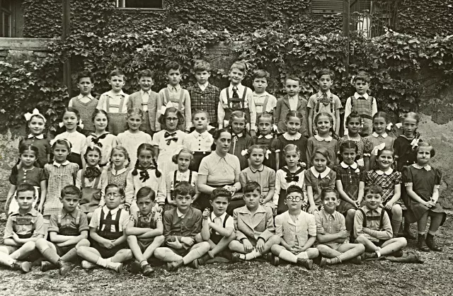 Ez a legaranyosabb kép. Ez a második elemista osztály, a Hollán utcai zsidó elemiből. Tanító néni a Teri néni, és ez egy koedukált osztály volt, fiúk, lányok vegyesen jártunk. 1940-ben kezdtem az elemit, ez 1942-ben készülhetett. Felülről a második sorban jobbról a hatodik vagyok.