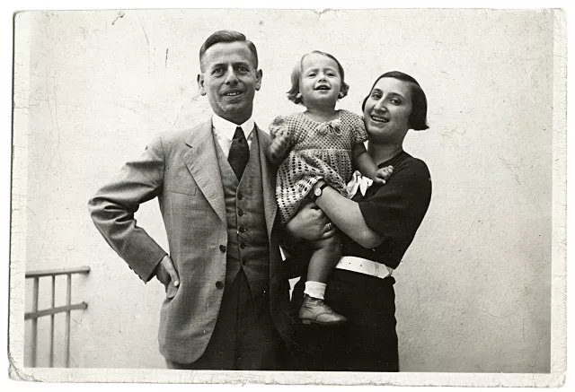 Ez a legcsodálatosabb kép. Édesapám, édesanyám és én 1935 októberében, másfél évesen. A kép a lakásunk gangján készült, akkor a Reitter Ferenc utca 3-ban laktunk. Az egy elég nyomorúságos ház volt.