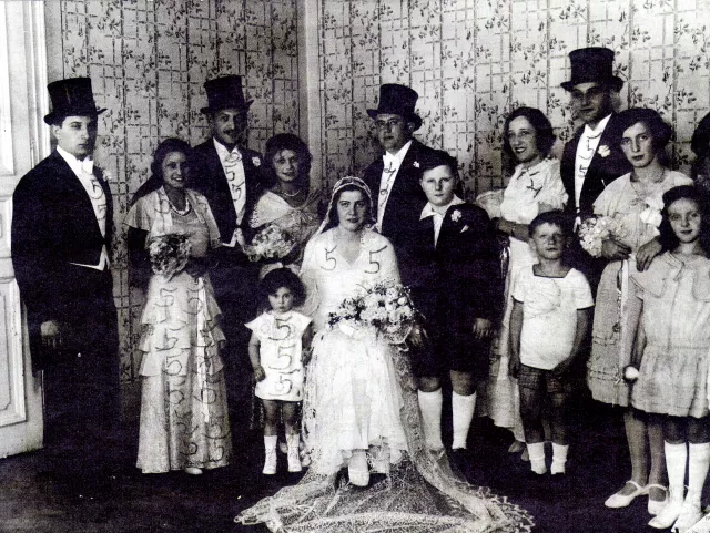 Ez a kép az unokatestvérem, Berner Judit esküvőjén készült, 1932-ben Budapesten. Spira Ernővel házasodott meg. Bal oldalon az első álló alak Muki [Berner Miklós], a következő férfi én vagyok, a kislány, a menyasszony balján, Mari, az unokahúgom, Joli nővérem kislánya. A menyasszony Berner Judit, és mögötte áll a férje, Ernő. A negyedik cilinderes férfi Dudus, a harmadik Berner gyerek.
