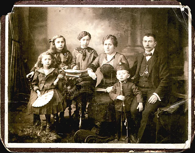 Ez az apukám Milka nevű testvére, mellette a férje, a Spitzer Adolf (jobbról az első), és Milka néni mellett a legidősebb lánya, aztán a Janka, az Irén, és elöl a kisfiú, Miklós. Olyan 1912-ben vagy 1913-ban készülhetett a kép Budapesten.