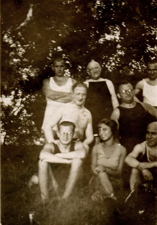Ezt a felvételt én csináltam, 18 éves koromban a Szentendrei -szigeten 1930-ban. Gyakran kirándultunk a Duna- mentén, és ekkor csónakáztunk. is. Az elsô sorban szemüveggel Pista, a legfiatalabb bátyám. Balról mellette a barátjának a húga. Fehér trikóban áll hátul Lajos, a középső bátyám. Mellette az édesapám. Bandi, legidôsebb bátyám középen szemüveggel, fekete trikóban. Takács Lajos leghátul a Lajos barátja volt. Trikó nélkül, középen Weinberger Aladár, a Pista a legjobb barátja volt. Az ô gyerekeit vittem át Budára valahova, és mikor elmentem a Vilmos-császár út 18. elôtt, akkor láttam, hogy pakolnak a sógornômék... mentek a csillagos házba. Neki két gyereke volt egy fiú meg egy lány.