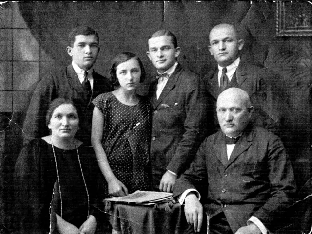 Ez a családi fotó a 20-as években készült. Az édesanyám és apám ülnek az első sorban, én, a család legfiatalbb tagja bátyáim között -- Endre,Lajos és Pista -- állok. Az édesapám csodálatos ember volt. Hallatlanul nyitott volt, igazságszeretô, és ebben szigorú. Ismert mindent, sok nyelven beszélt, és amikor Brünnben tanultam, volt egy rendelet, hogy nem lehetett valutát kiküldeni Magyarországról. Akkor apa megcsinálta azt, hogy a felvidéki templomokban az ünnepeken énekelt mint kántor. Mindent tudott a vallásról is, a pészach nálunk mindig csodálatos ünnep volt. Jellemző rá, hogy széder estén (pészach bejövetelének estéje) apa mindig tartott egy nagy politikai elôadást. Például 1932 -ben a Solte István és a Rajk László is ott volt a széderünkön. Arról besztélt, hogy az ô véleménye szerint a zsidóságnak a feladata a világban a kultúra és a humanizmus terjesztése. Ez volt a hitvallása és ennek a jegyében élt, és nevelt bennünket. A politikától bizonyos fokig távol tartotta magát. Nem volt hajlandó például a Tanácsköztársaság alatt pozíciót vállalni, mert úgy gondolta, hogy erre még nem érett meg a társadalom. Apa nem ellenezte kommunista mozgalmi tevékenységemet. Kicsit büszke is volt, és azt akarta, ne háziasszony legyen belôlem, hanem valamivel több. Legyen szakmám, tudjak dolgozni önállóan.