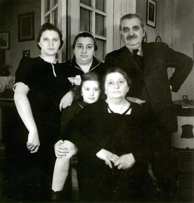 Ez a kép a lakásunkban készült 1934-ben. Hátul baloldalt áll a nővérem, Joli, mellette a nagynéném, Celin néni és apukám. Előttük ül anyukám, és mellette Joli lánya, Mari.