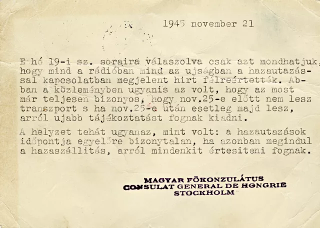 1945. november huszonegyedikén a következő választ kapta a stockholmi Magyar Főkonzulátustól: "E hó 19-i sz. soraira válaszolva csak azt mondhatjuk, hogy mind a rádióban, mind az újságban a hazautazással kapcsolatban megjelent hírt félreértették. Abban a közleményben ugyanis az volt, hogy nov. 25-e előtt nem lesz transzport, s ha nov. 25-e után esetleg majd lesz, arról újabb tájékoztatást fognak kiadni. A helyzet tehát ugyanaz, mint volt: a hazautazások időpontja egyelőre bizonytalan, ha azonban megindul a hazaszállítás, arról mindenkit értesíteni fognak."
