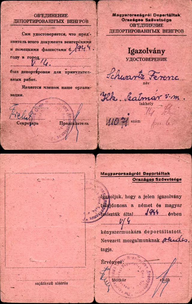Ez az eltávozási engedélyem, amellyel hivatalos ügyben kiléphettem a hitzendorfi munkaláger területéről. Az engedélyt a német építésvezető írta alá, és 1945. május 1-től május 31-ig volt érvényes, reggel öt órától este kilencig.