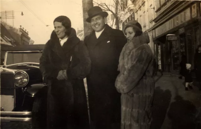 Úgy nézem, hogy [Nagy]Szebenben készült ez a fénykép, és körülbelül az én születésem előtt, valamikor 1932-ben, valószínűleg mindjárt a szüleim esküvője után. Rajta van apu, anyu, a jobb oldali nő pedig a fogorvos nagybácsimnak, Márer Jenőnek a felesége. Ez a Márer Aranka anyámnak unokatestvére volt, és annak a nagybácsinak a felesége. A nő nem dolgozott soha, a nagybácsi volt a fogorvos, magán rendelős, ő jól tudta tartani. Nekik is mindig volt autójuk, már az 1930-as években.