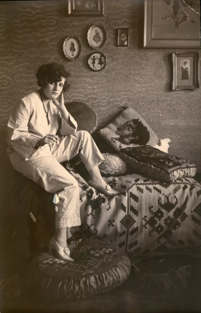 Anyám van a képen. A fénykép Tövisen készült, otthon. Neki külön szobája volt, még emlékszem, mondta, hogy "Ez volt a leányszobám". Ezek közül a képek közül, amik a falon vannak, már egyre sem emlékszem, viszont erre a kerek párnára igen, ami a lába alatt van. Ki tudja, hogy a háború alatt mi lett vele? Valahová elkallódott.