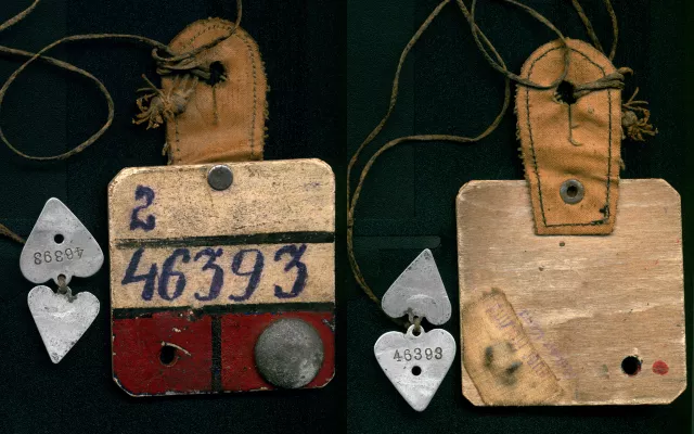 Őneki Auschwitzban, hogy hamar eljött, nem égették be a bőrébe a számot [Az auschwitzi munkatáborok foglyainak bal karjára, az alkaron, a belső könyökhajlatban, négy-, öt- vagy hatjegyű számot és esetleg betűjelet is tetováltak, s ezt a jelzést a továbbiakban a nevük helyett viselték. Mintegy 405 ezer ilyen azonosító számról maradt fenn kimutatás. A regisztrált foglyok közül összesen 65 ezer maradt életben. -- A szerk.]. Ez az Auschwitz utáni, a bunzlaui száma: 46393. Valószínűlega nyakukban viselték, egy kis négyszögletű, fából készült jelvényszerűség.