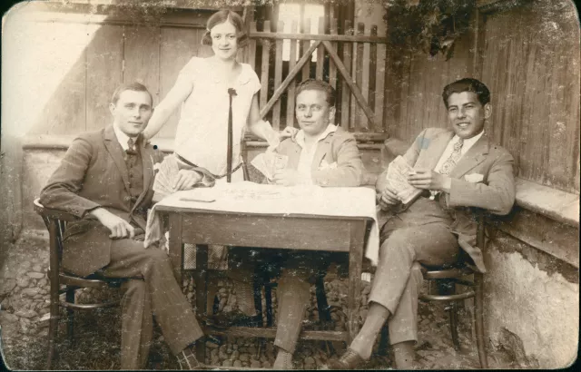 Itt édesapám [Szántó Ervin] a jobb oldali széken ülő férfi. A fényképen szereplő három másik személyt nem ismerem sajnos, több mint valószínű, hogy a baráti kör lehetett. Ez is az 1920-as években készülhetett [Ugyanaz a helyszín, mint a ROOSZ005.jpg sz. képen. -- A szerk.]. Nőtlen volt apám.