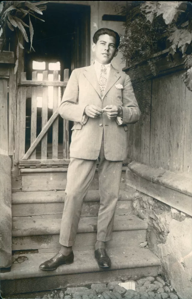 Ez édesapám [Szántó Ervin], aki 1902-ben született, itt még nőtlen volt, ez azt jelenti, hogy az 1920-as évek végének a fényképe. Egy falusi háznak a tornácán van, mert nem néz ki városi háznak, de fogalmam sincs, hol lehet. Az biztos, hogy Magyarország területén van.