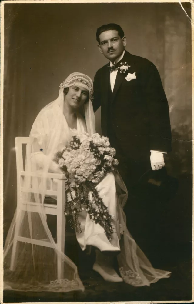 Ezen a fényképen édesapámnak [Szántó Ervin] a bátyja van a menyasszonyával. Ők Fiuméban laktak, úgy hívták a nagybácsit, hogy Szántó József, és ez a kép 1923-ban, május tizenkilencedikén készült, és küldték édesapámnak emlékül.