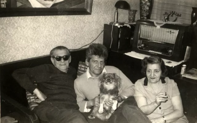 Az 1970-es években készült a kép a Carpati [Kárpátok] negyedben, balról az első édesapám, az ölemben van a Johnny nevű japán pincsi kutyám, anyám a cigarettával a kezében, hátul a Strasfurt rádió. Még ma is megvan, “műemlék”. Ezt a bútort a Székely és Réti-féle híres gyárban rendelték. Úgy kell elképzelni, hogy ez volt a nagyobbik része, ahol itt ültünk, és akkor innen kereken, görgőn tovább lehetett tolni, és egy hosszú nagy széles ágy alakult ki. Tehát nappal nappali volt, este pedig hálószoba volt.