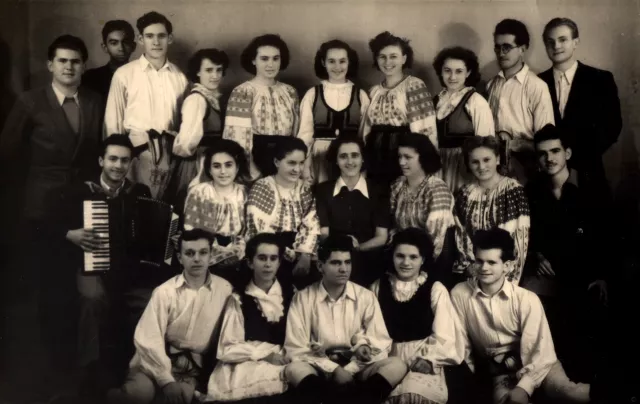 Ez az egészségügyi technikumnak az osztálya, ahová én jártam, és a székely népitáncos csoport. Az alsó sorban pont a közepén vagyok. A technikumnak az utolsó évében volt. Saját zenekarunk volt, harmonika, hegedű és a Székely Népi Együttestől járt valaki, aki betanította nekünk a székely népi táncokat. És aztán ilyen iskolák közti versenyekre játunk. A képen vegyest van román és magyar népviselet is.
