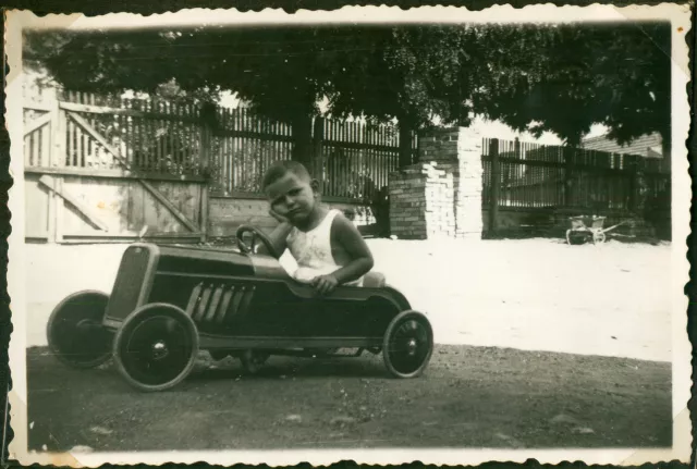 Itt már abszolút nagy vagyok, már autóvezetői jogosítványt szereztem. A fénykép Tövisen van az udvaron, a háttérben látszik pár tégla. Lehettem olyan négyéves körül, a kép tehát 1937 körül készülhetett. De nemcsak gyerekautóm volt, hanem volt egy kicsi szekerem is. Abban az időben egy ilyen autó nagyon nagy dolog volt egy gyereknek. A születésnapomra vagy hasonló alkalomra kaphattam, de hogy nem Romániából, az is biztos. És ha jól tudom, legalábbis úgy rémlik, az ilyen értékesebb ajándékokat mindig a mérnök nagybácsikámtól kaptam, a Tuszi bácsitól [Márer Artúr], lehet, hogy ez is onnan jött. De egyébként sem volt probléma nekünk megvenni egy nagyobb ajándékot. Sok pénzünk volt mindig. Talán még kisebb voltam, mikor burrogtattam állandóan, és a széknél kormányoztam, szóval abszolút autómániás voltam már kisgyerek korom óta, akárcsak most. Most is imádok vezetni.