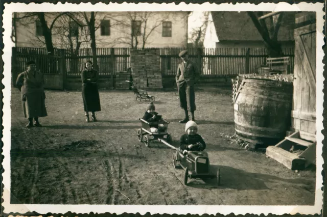 Ez a kép Tövisen készült, az udvaron 1936-37 körül. A háttérben lévő ház a református parókiának az épülete, de az már átesik az útnak a túlsó oldalára. Pont velünk szemben volt a református parókia Tövisen. Az első az autóban én vagyok, olyan három-négy éves lehettem, a hátam mögött pedig a szomszédnak a fia. A kicsi fiú, aki a szekérben van, egy évvel fiatalabb, mint én, úgy hívják, hogy Asztalos Iván. A szomszéd egy ékszerész mesterségű bácsika volt, a fiából viszont orvos lett. Most körülbelül ő is nyugdíjas, Medgyesen volt nyugdíjazást engedélyező szakorvos [Föltehetően a rokkantnyugdíjazásban közreműködő orvos volt. -- A szerk.].