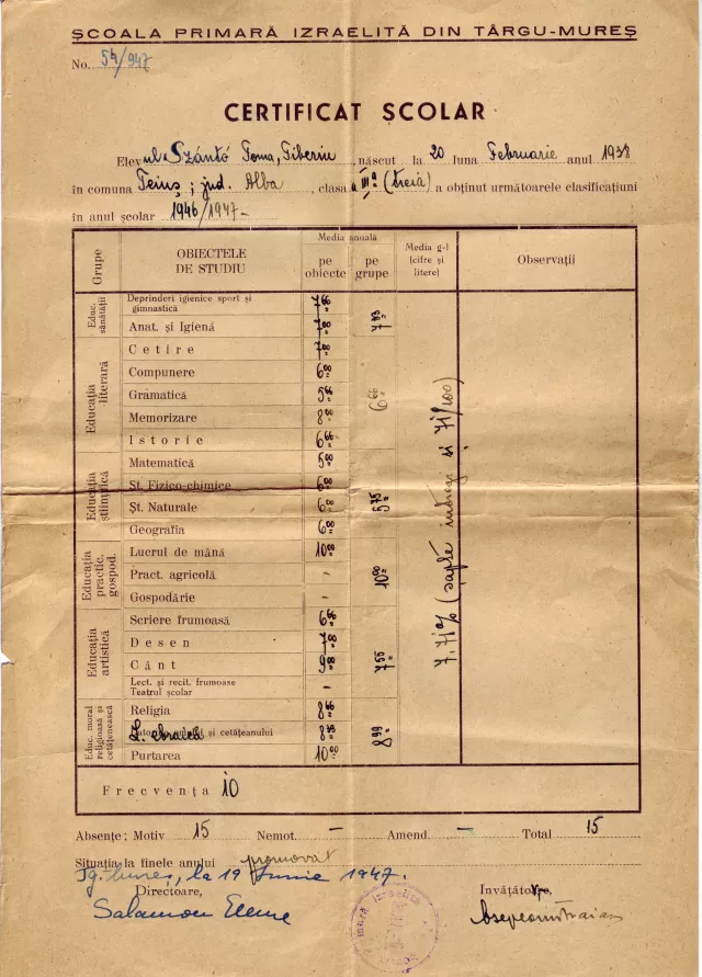 Az igazgatónő is meg a tanítók is mind zsidó származásúak voltak. Románul folyt a tanítás, de tanultak héber nyelvet is és vallástant, zsidó vallást. Azonkívül a megfelelő tantárgyak, ugyanúgy, ahogy egy állami iskolában. Hogy a vallást egy rabbi tanította-e, nem tudnám megmondani, azt hiszem, még az öcsém sem tudja pontosan, hogy ki tanította. De abban az időben Marosvásárhelyen még volt rabbi.