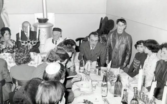 Ez a zsinagóga melletti kisteremben van, Marosvásárhelyen. Egy kisfiú valószínűleg a má nistánát mondja. Szédereste lehetett. Én leghátul vagyok, balról az első, mellettem pedig Aladár, a második férjem. (Huszonnégy évig voltam Aladár felesége.) Nem ismerek mást a képen. Nagyon szép volt, előírásszerűen ment minden: imádkoztak, megvolt a kézmosás is. Akkor még sokan voltak zsidók, és látszik a képen, hogy sok gyerek is volt. Most is sokan vannak a széderestén, de a fele már nem zsidó.