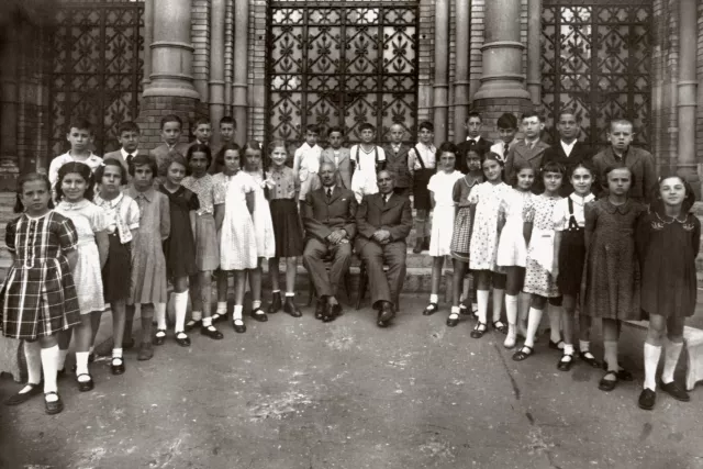Ez a szegedi zsidó elemi iskola osztályképe. Ez a harmadikos osztály. Én jobbról a fiú sorból a harmadik vagyok. Középen ül Ligeti bácsi, a tanítóm és Székely bácsi, az igazgató.