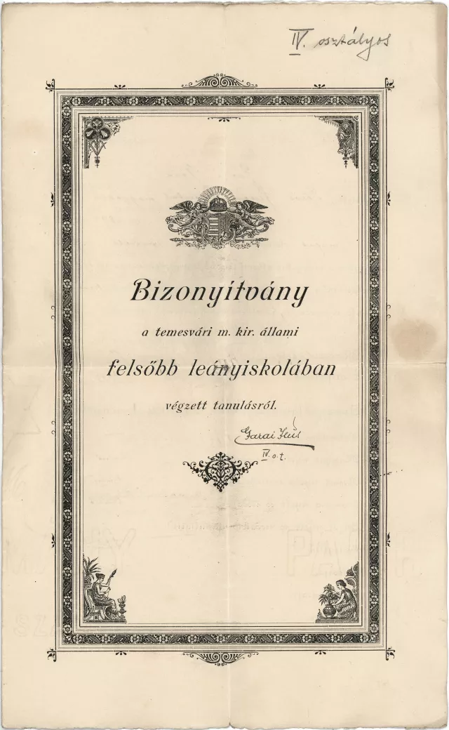 Bizonyítvány a temesvári m. kir. állami felsőbb leányiskolában végzett tanulásról