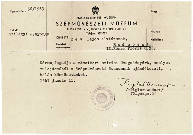 Kérem, fogadja a rómaikori szíriai üvegedényért, amelyet tulajdonából a Szépművészeti Múzeumnak ajándékozott, hálás köszönetünket.