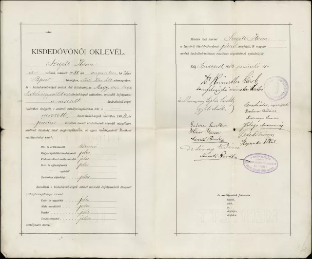 Ez nagymamám [Hoffmann Lászlóné, szül. Szigeti Ilona] kisdedóvónői képesítő oklevele 1904-ből. Kiadta "A Magyarországi Központi Frőbel-nőegylet áll. segély. Óvónőképző-intézete".