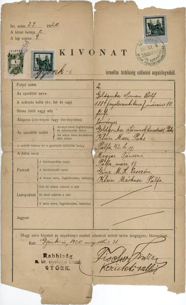 Ez a kivonat apám Goldgruber Simon születési anyakönyvi kivonata. A Tolna megyei Gyönk, izraelita hitközsége állította ki 1920-ban.