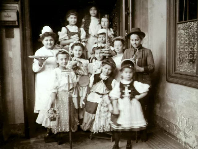 Ezek pedig a Margit és a Liszi, a Kornélia, a Blanka néninek a két kislánya [a két magyarruhás kislány az első sorban]. A Schiller Blankának - és a Baumhorn Lipótnak a gyerekei. Valószínűleg, hogy az ő lakásuk előtt lehetett. Ez valami jelmezbál-szerű lehetett, mert mindenkin valami jelmez van. Rengeteget voltak együtt az unokatestvérek, együtt nyaraltak mindig.