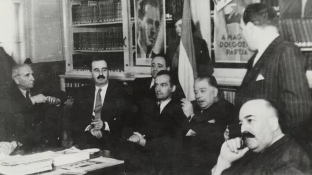 A kép 1947-ben készült a hitközség helyiségében, ahol arról tanácskoztak, hogy át kell adni a zsidó kórházat az államnak. Ülnek jobbról balra: Domonkos Miksa, Stöckler Lajos, Dr. Vikol János kommunista államtitkár, akinek az egyházi intézmények államosítása volt a feladata, és végzettsége szerint orvos volt. Az álló alak Dr. Benedek László igazgató-főorvos. Külön érdekessége a képnek, hogy a zsidó hitközség hivatalos helyiségében ott van az MDP plakátja és Apró Antal képe.