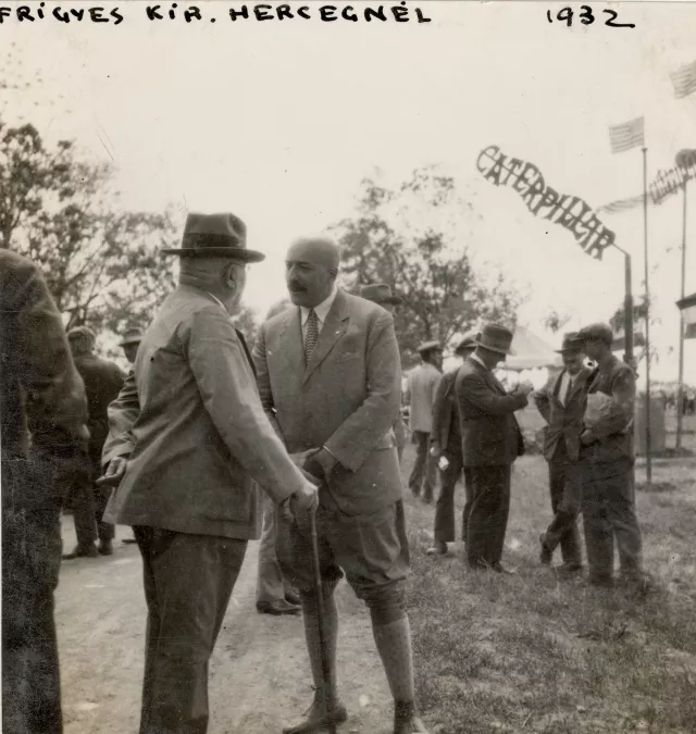 A kép 1932-ben készült Frigyes főherceg birtokán, ahol apám bemutatót tartott a Caterpillar traktorral. A kalapos úr Frigyes főherceg. [Habsburg Frigyes főherceg (1856--1936) -- katona, tábornagy. Az első világháború után birtokainak legnagyobb részét a cseh kormány elkobozta, és miután pozsonyi otthonát is elvesztette, állandó lakóhelyül mosonmagyaróvári birtokát választotta, ahol teljes visszavonultságban gazdaságának élt. 1927 és 1936 között a felsőház tagja volt. -- A szerk.]
