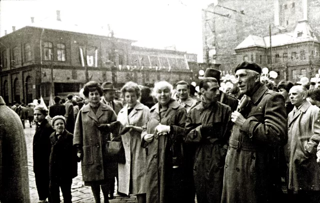 Május elsejei felvonulás 1962-ben. A kép jobb szélén micisapkában Noel Field, jobbról a harmadik ősz hajú hölgy Herta, a felesége. Mellette világos kabátban én állok.