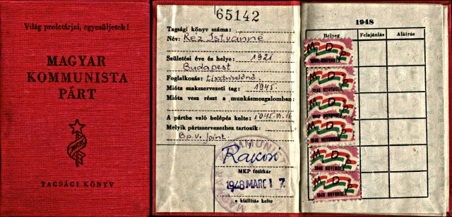 Ez a párttagsági könyvem. A Kommunista Pártba beléptem, amint lehetett. A könyv tanúsága szerint 1945. június 16-án a léptem be. Ezt a tagsági könyvet 1948. március 17-én töltötték ki, az aláírás: Rákosi.