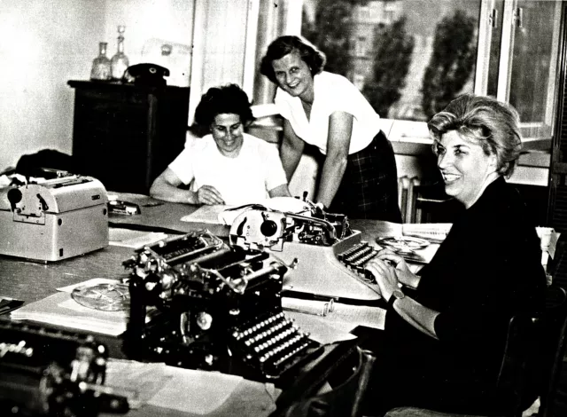 Ez a kép Szófiában készült 1966-ban a VIT [Világ Ifjúsági Találkozó] fordítóirodájában. Én a jobb oldalon ülök. Én akkor a Boldizsár Iván titkárnője voltam, és kikértek erre az időre.