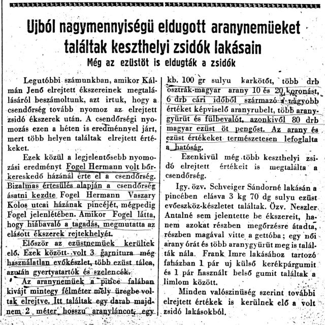 Az aranyneműek a pince falában kivájt mintegy félméter mély üregbe voltak elrejtve. Itt találtak egy darab majdnem 2 méter hosszú aranyláncot, egy kb. 100 gr sulyu karkötőt, több drb osztrák-magyar arany 10 és 21 koronást, 6 drb cári időből származó s nagyobb értéket képviselő aranyrubelt, több aranygyűrűt és fülbevalót, azonkívűl 80 drb magyar ezüst öt pengőst. Az arany és ezüst értékeket természetesen lefoglalta a hatóság.'