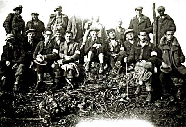 Ezt a képet a sógorom, Ganz Izrael hagyatékában találtuk "utazás a munkásszázadba" felirattal. Sajnos senkit nem tudok a képen azonosítani, ami az 1940-es evek elején készült. Az látszik, hogy mindenkin rajta van a sárga karszalag. Itt mindenki még viszonylag jó állapotú ruházatban van: a kabátok tiszták, a kalapnak van tartása, több személyen nyakkendő van. Viszonylag vidámak, tehát még nem tudják, mi vár rájuk.