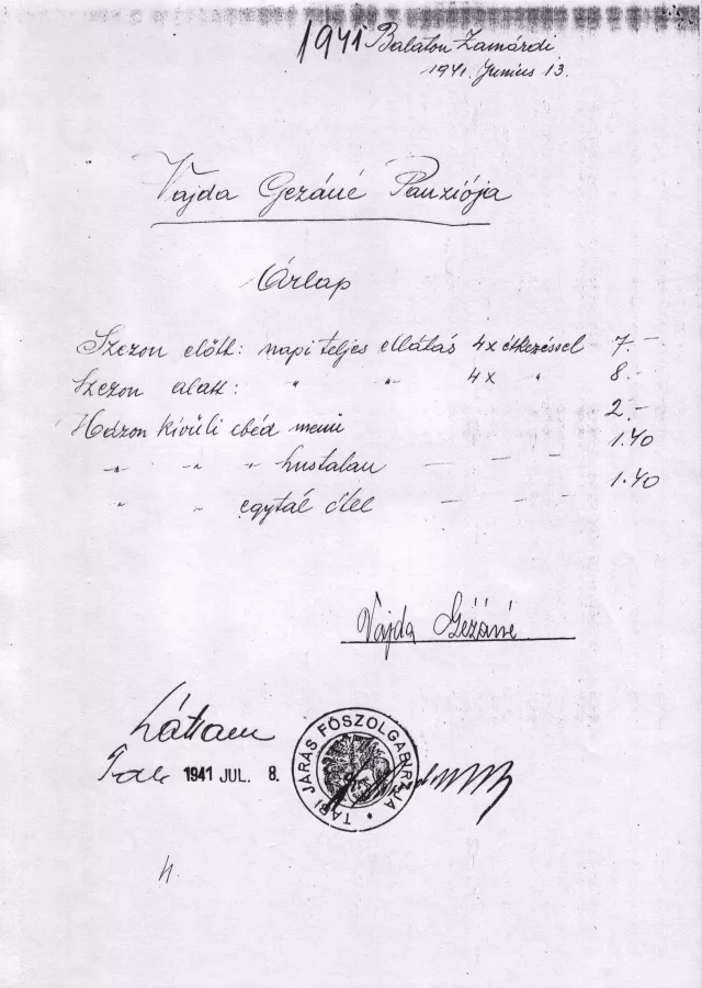 Ez egy árjegyzék apám testvérének, a Géza feleségének a panziójából. [Ezt a dokumentumot az interjúkészítő találta Balatonzamárdin, egy helyi falukutató iratgyűjteményében. A kutatásban a helyi Turinform iroda működött közre.]