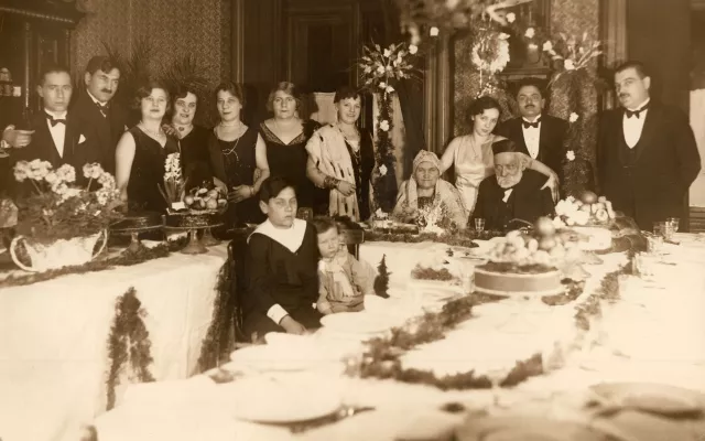 A nagyszülők mögött áll jobbról balra: Váradi Lajos, akinek a Király utcában volt egy szép csemegeüzlete, Váradi Ármin, aki Amerikában nyitott kozmetikai üzemet, mellette lánya, Manci, aki 1956-ban ment ki családostól az apja után, majd édesanyja, Pataky Aranka, aki itthon maradt, és Pesten volt kozmetikája. Wittmann Ilus, Váradi András felesége, akinek Bécsben volt kozmetikai iskolája, utána Hercog Erzsébet, Bözsi néni, Lajcsi bácsi felesége, majd anyukám, Bauer Lászlóné Váradi Ilona, illetve Mezei Piroska, a meghalt Váradi Szerén lánya. A férfiak: Váradi András, aki Bécsben élt, és édesapám, Bauer László. Középen bátyám, Ferkó és én.