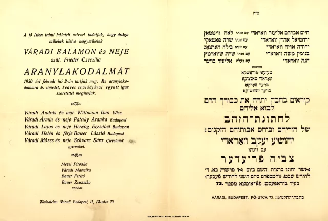 Nagyszüleim, Váradi Salamon és Frieder Czeczilia kétnyelvű aranylakodalmi meghívója 1930-ból.