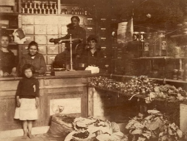 A képen középen édesanyám [Váradi Ilona]. Mögötte, valami létrán az egyik fivére, Váradi Lajos katonaruhában, nyilván szabadságon volt, bal szélen a nagymamám [Váradi Salamonné, született Frieder Czeczilia]. A pult mögött álló idősebb nő talán egy alkalmazott, a kislány ismeretlen.