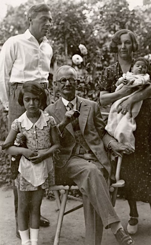 Anyai nagyapám [Garai Izsó] a kertjében, Pancsován, ahova, ameddig élt, minden nyáron lementünk. A képen anyám látható, a karjában én csecsemőként, nagyapám, apám és a nővérem.