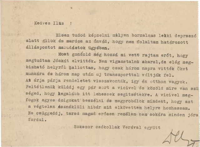 Az árja párja rendeletet visszavonták, így én otthon vagyok. Feltétlenül külddj egy pár sort a vicivel és közöld mire van szükséged, hogy legalább itt lehessek segitsétekre. A vicivel megfogok egyes dolgokat beszélni és meprobálok mindent, hogy azt a végtelen észnélküli hibár mit elkövettem helyre hozhassam. Ne csüggeddj, tarsd maga erősen remélem nem sokára minden jóra fordul. Sokszor csókollak Verával együtt. Dezső"