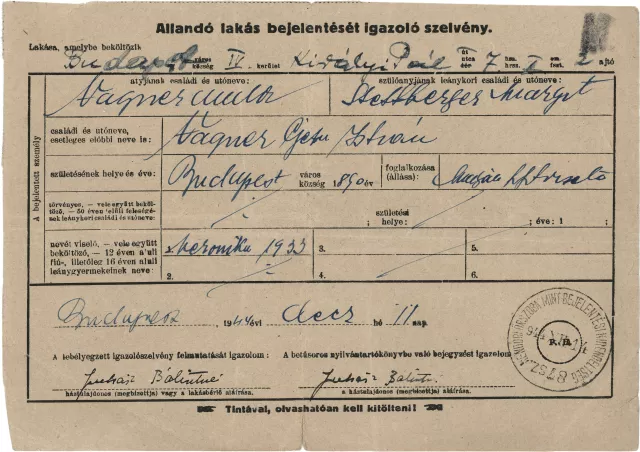 1944 novemberében lett egy lakáskulcsunk. Ez pedig úgy lett, hogy Dezső bácsi egyik fiának a keresztény felesége, Sárika rokona volt egy vezérezredesi rangban lévő katonaorvosnak, nádai Náday Lajosnak. A vezérezredes felesége Sárika nagynénje volt. A vezérezredes urat a hadsereggel vitték nyugatra, és vele ment a felesége. Nádayné odaadta a lakása kulcsát az unokahúgának, Sárikának, aki pedig odaadta nekünk. Egy nagy úri lakás volt a Királyi Pál utca 5--7-ben, az első emeleten. A továbbiakat ott vészeltük át. Akkor már megvoltak a papírjaink, mi voltunk az evangélikus Vágner család, aki Gyöngyösről menekült. Azért döntöttek a szüleim így, mert akkor Gyöngyösön már oroszok voltak, másrészt az volt az egyetlen vidéki város, amit ismertem. Nekem nem vettek papírt, de szerepeltem az ő papírjaikon. A nevem maradt Veronika, mert látták ugyan, hogy megbízható vagyok, de ha valaki elkiáltaná magát, és felkapnám a fejem, az lebukás lenne. Volt egy elképesztő véletlen. Amikor odaköltöztünk, kiderült, hogy nádai Náday Lajosné leánykori neve Wagner Mária. Csak ő dupla vével írta. A papírjaink szerint mi is Vágnerek voltunk, úgyhogy a házmesterhez úgy vonultunk be, hogy Mária az apám unokanővére. Itt viszonylag biztonságban éreztük magunkat.