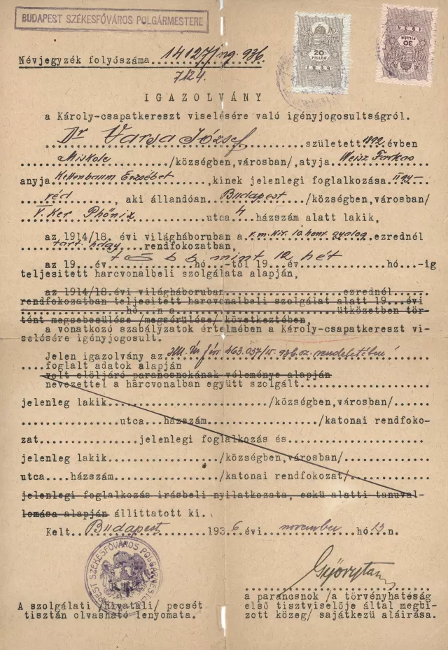 Dr. Varsa József, született 1892 évben Miskolc városban, atyja Weisz Farkas, anyja Kettenbaum Erzsébet, kinek jelenlegi foglalkozása ügyvéd, aki állandóan Budapest városban V. Phőnix utca 4 házszám alatt lakik,