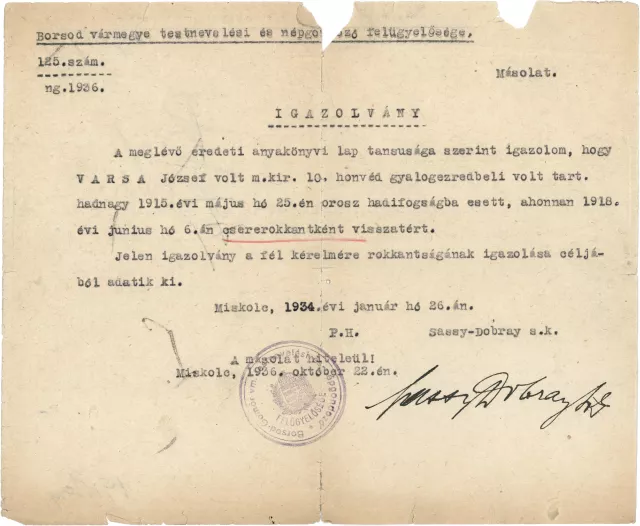 A meglévő eredeti anyakönyvi lap tanúsága szerint igazolom, hogy Varsa József volt m. kir. 10. honvéd gyalogezredbeli volt tart. hadnagy 1915. évi május hó 25-én orosz hadifogságba esett, ahonnan 1918. évi június hó 6-án csererokkantként visszatért.