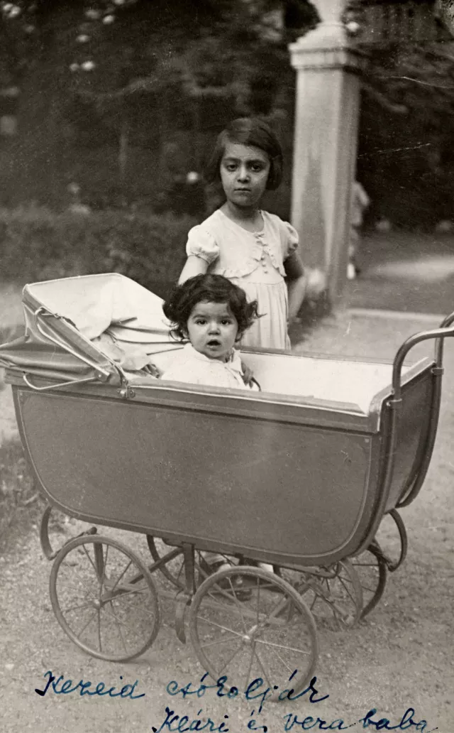 A kép 1934-ben készült, a Margit-szigeten. A levelezőlapot apámnak küldtük, aki akkor épp a mátraházi Állami Szanatóriumban volt. A képen a nővérem látható és én.