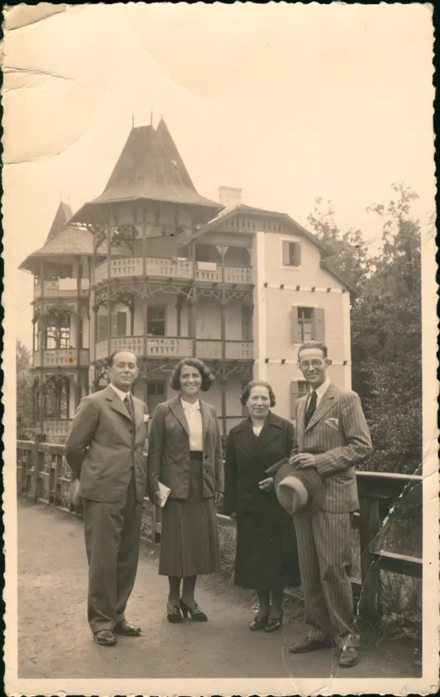 Ez a fénykép Szovátán készült, írja is a hátán, hogy Sovata Bai [Szováta fürdő], Foto Vilus et Company. Aki ismeri Szovátát, az tudhatja, hogy például valamikor ezt az épületet a Ghidali-féle villának hívták. Bal oldalon van a nagybácsi, Márer Jenő, mellette jobbra a felesége, a harmadik személy az anyai nagyanyám, Weissberger Hermina, és egészen jobb oldalon ennek a Márer Jenőnek a testvére, mi Márer Tuszi bácsinak hívtuk, hogy a keresztneve Artúr volt. Ő volt az, akit elvittek munkaszolgálatba a magyarok, és formálisan éhen halt, mert nem tudta enni a kosztot. Annyira kényes volt, hogy abszolút nem tudta fogyasztani azt a kosztot, amit kaptak. Kollégái, akik visszajöttek, mondták, hogy egyszerűen nem evett, és úgy halt meg, végelgyengülésben. A nagyanyám és nagyapám nevelte tulajdonképpen a két fiút, a nagyobbikból fogorvos lett, a kisebbik, aki meghalt a munkaszolgálatban, gépészmérnök volt.