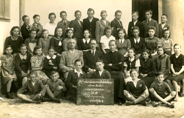 A felvételen a dunaszerdahelyi római katolikus népiskola látható. A kép 1940-ben vagy 1941-ben készült. A második sorban balról a harmadik, olyan virágos ruhában az Irma testvérem. Irma befejezte az iskolát, és elkezdett dolgozni mint eladó, de nemsokára mind a három testvérem elment Pestre, mert már a szüleim nem tudták fenntartani őket.