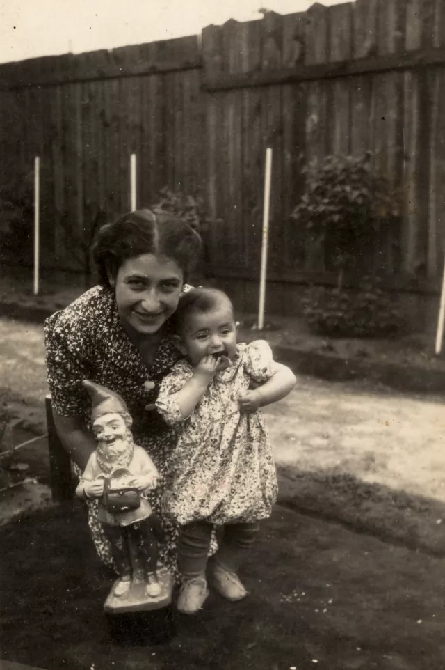 Ez a nővérem, Szerén és kislánya a házuk udvarán. Szerén 1911-ben született. Háztartásbeli volt. Pestre ment férjhez, Wilheim Imréhez, aki egy bőrkereskedőnél volt adminisztrátor, később az üzletet vezette. A kislányuk nevét már nem tudom, de azt igen, hogy 1939-ben született. Auschwitzba kerültek, és nem jöttek vissza. Imre munkaszolgálatos volt, hazajött. Újranősült és 1956-ban kiment Ausztráliába.