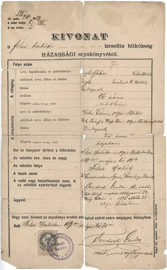 Ez a házassági anyakönyvi kivonat az én anyai nagyszüleimé volt. 1889-ben kötöttek házasságot Felső-Hahóton. Ez egy kivonat az eredetiről, 1910. május huszadikán állították ki.