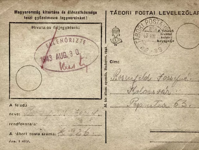 This is a standard army postcard sent from the Ukraine by my uncle Jozsef Rosenfeld to his wife Jolan, my mother's younger sister.