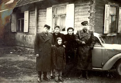 This picture was taken by our house in Jurbarkas in the mid-1950s. We had to sell it since my husband was to work in another town. The picture was taken before our departure. My husband and I are standing to the right, my friend Miriam is to the left with her husband Yankle and daughter Channa. They bought our house.